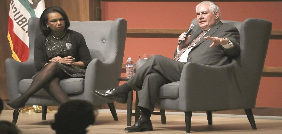 وزير الخارجية ريكس تيلرسون وكونداليزا رايس في جامعة ستانفورد - كاليفورنيا