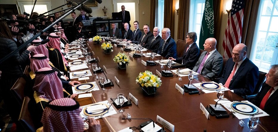 الرئيس الأمريكي دونالد ترامب خلال اجتماعه في واشنطن بولي العهد السعودي الأمير محمد بن سلمان والوفد المرافق له