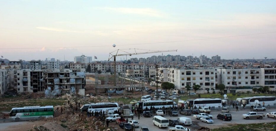 حافلات تنقل مواطنين سوريين من حلب ضمن سياسة التهجير القسري التي ينتهجها النظام السوري وحلفاؤه