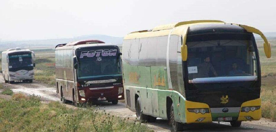 حافلات تنقل مهجرين من كفريا والفوعة بموجب اتفاق بين هيئة تحرير الشام وإيران