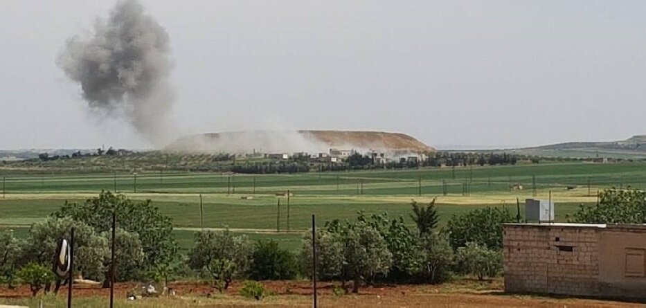 آثار القصف المتبادل بين جبهة تحرير سوريا وهيئة تحرير الشام في تل عاس بين الهبيط وخان شيخون بريف إدلب الجنوبي
